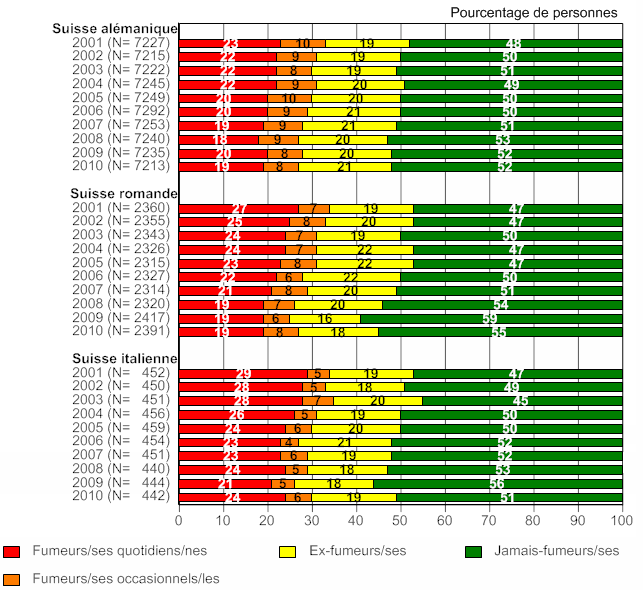TMS - Evolution du statut de consommation de tabac de 14 à 65 ans, par région linguistique (2001-2010)